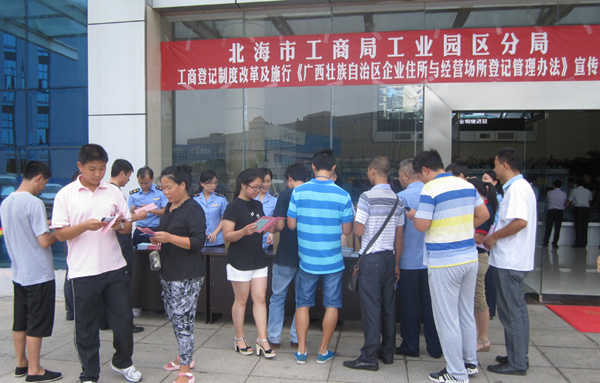 在中國電子北海產(chǎn)業(yè)園宣傳現(xiàn)場,工業(yè)園區(qū)工商分局負責人表示,“從材料的申請?zhí)峤恢赁k證,承諾為期7個工作日辦好,根據(jù)園區(qū)的優(yōu)質(zhì)企業(yè),特事特辦,急事急辦,材料齊全的即可當天頒證。”據(jù)了解,此次政策免去驗資等手續(xù),不但節(jié)約時間,還降低企業(yè)成本。中國電子北海產(chǎn)業(yè)園園區(qū)企業(yè)北海高創(chuàng)電子信息孵化器有限公司領(lǐng)到了新版營業(yè)執(zhí)照,新版由以前的橫版改為豎版,沒有了實收資本一項,并且左下角有一個二維碼,掃描成功后就能看到企業(yè)名稱、法人、注冊時間等登記信息。工作人員表示,“這次工商登記制度改革對于創(chuàng)業(yè)者最大的實惠就是注冊資本由實繳改為認繳登記,企業(yè)籌集資金的壓力就小了很多。而且現(xiàn)在辦理執(zhí)照不需要再提供驗資報告等各種材料,只提供場地證明、公司章程就可以申請設立登記,提交的資料簡化了,手續(xù)自然就簡單便捷了,從人員的招募到辦理登記,節(jié)省了幾個月的時間。”北部灣電子信息科技企業(yè)孵化器的創(chuàng)業(yè)青年者紛紛前來咨詢,工業(yè)園區(qū)工商分局熱情、細致地為咨詢者解惑,同時發(fā)放了申辦宣傳材料,為創(chuàng)業(yè)者們提供專業(yè)、便捷、高效的全方位咨詢服務。